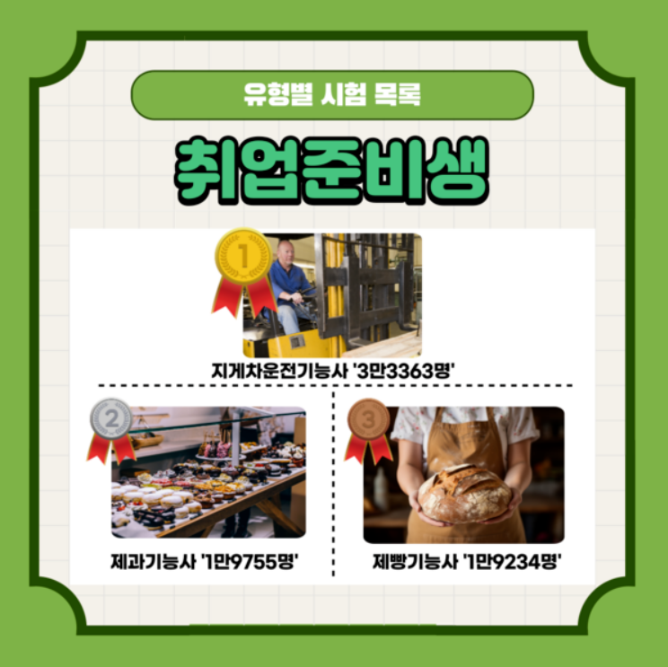| 3. 미용사(피부) | 7,273명 | 3. 지게차운전기능사 | 6,108명 | ||