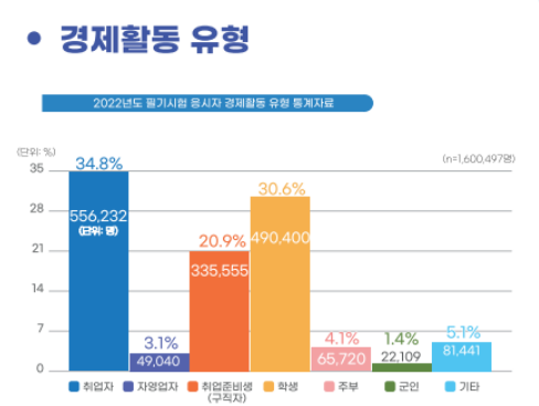 전 응시자 중 취업자가 34.8%로 가장 높은 비율을 차지했고, 그다음으로 학생 > 취준생 > 주부 > 자영업자 > 군인 순으로 나타났습니다. 연령대별로 보면 20대 > 30대 > 40대 순이었고, 학력은 대학교 > 고등학교 > 전문대 순이었습니다.