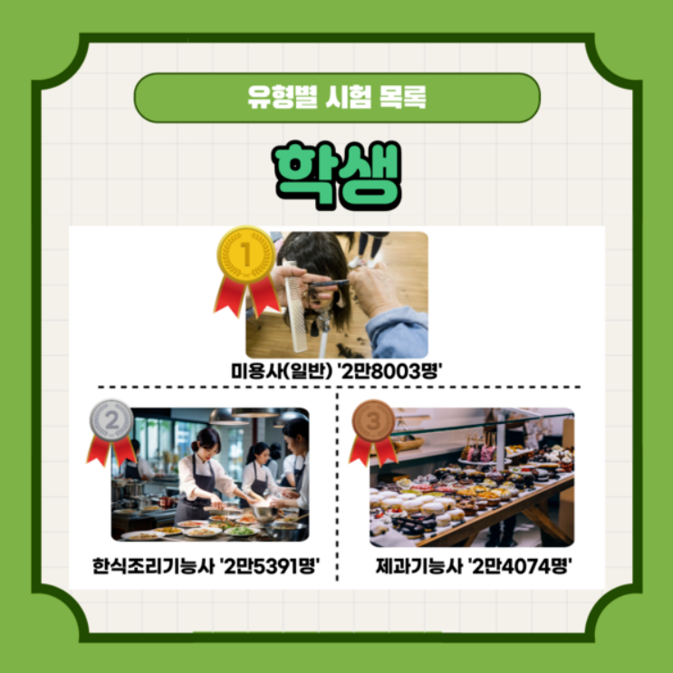 | 5. 제빵기능사 | 6,844명 | 5. 미용사(피부) | 3,213명 | ||