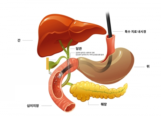 - 담도폐쇄(담즙이 내려 가야 하는 길, 담도가 막힌 상태)로 담도(담즙이 흐르는 길)에 스텐트를 넣어 정상적으로 흐르게 해야 한다고 하셨습니다. 담도는 췌장과 만나 십이지장으로 이어지기 때문에 십이지장을 조금 잘라 담도 쪽에 스텐트를 삽입하여 담즙이 흐르게 하는 시술이라고 하셨습니다.