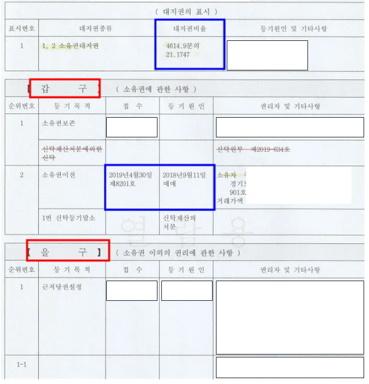 법원 등기소 들어가서 떼보시면 표제부, 갑구, 을구 이렇게 되어있을 텐데요..