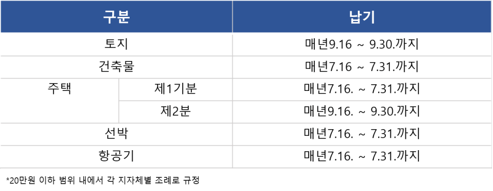 건축물과 선박, 항공기, 토지는 바로 7월!! 에 재산세를 한 번 내야 하니 잊지 마시기 바랍니다. 주택만 빼고는 모두 7월이니 아래 납부기간 표도 참고해 주시기 바랍니다.